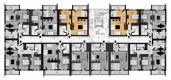 Planograma cu dispunerea Apartamentelor cu 2 camere TIP C pe etaj. Apartamentele sunt disponibile la etajele 1,2,3,4,5,6,7 si 8