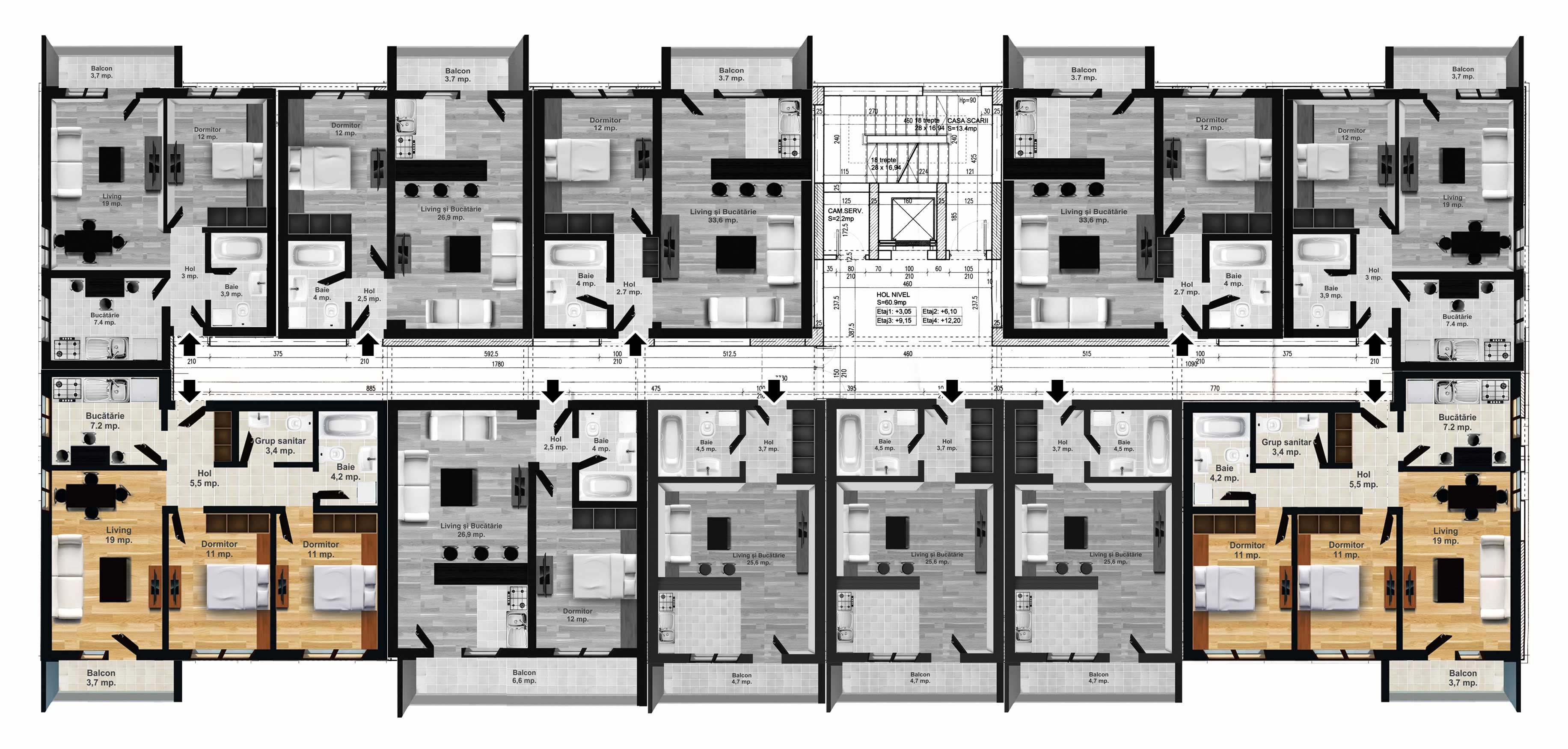 Planograma cu dispunerea Apartamentelor cu 3 camere pe etaj.